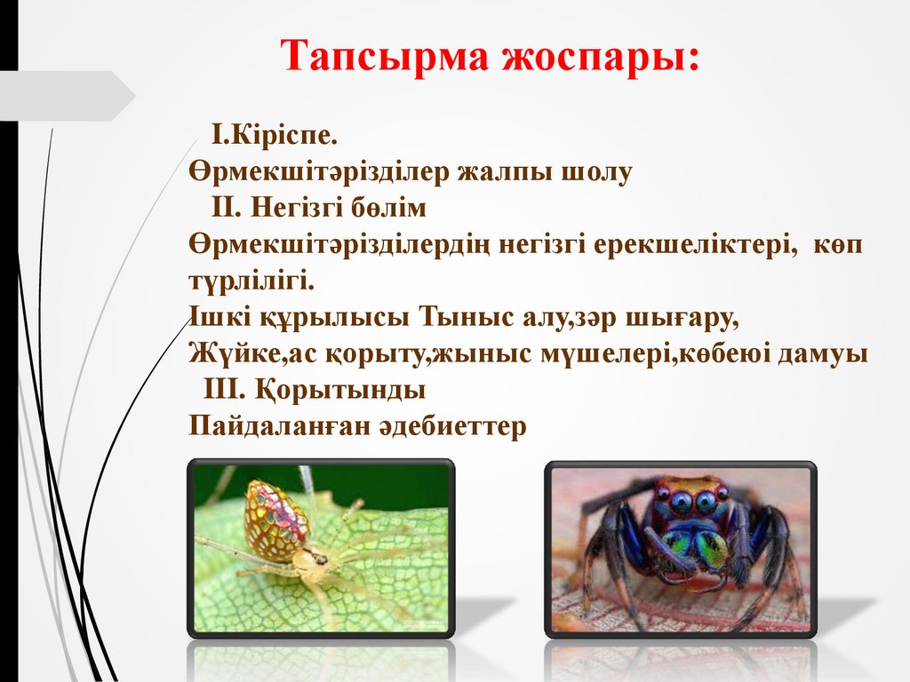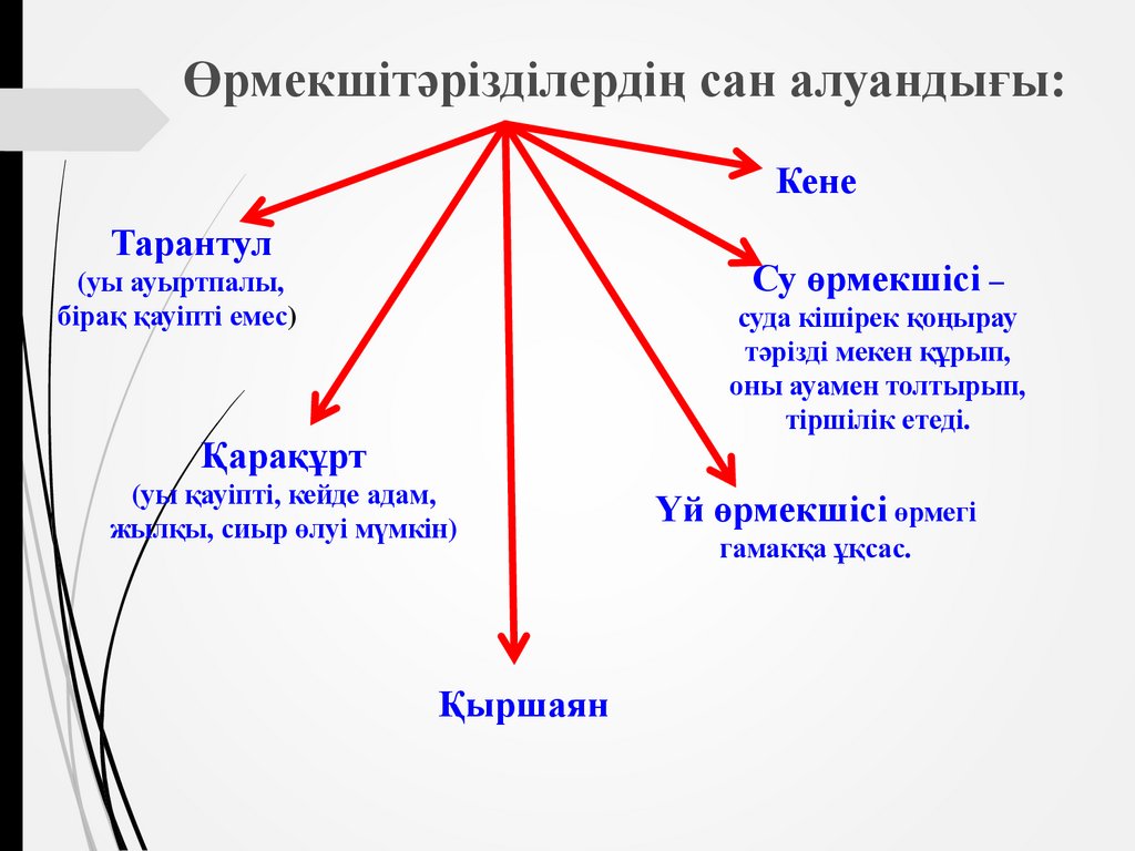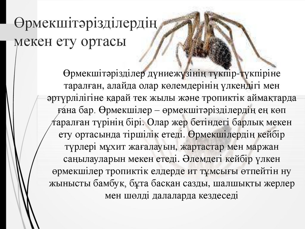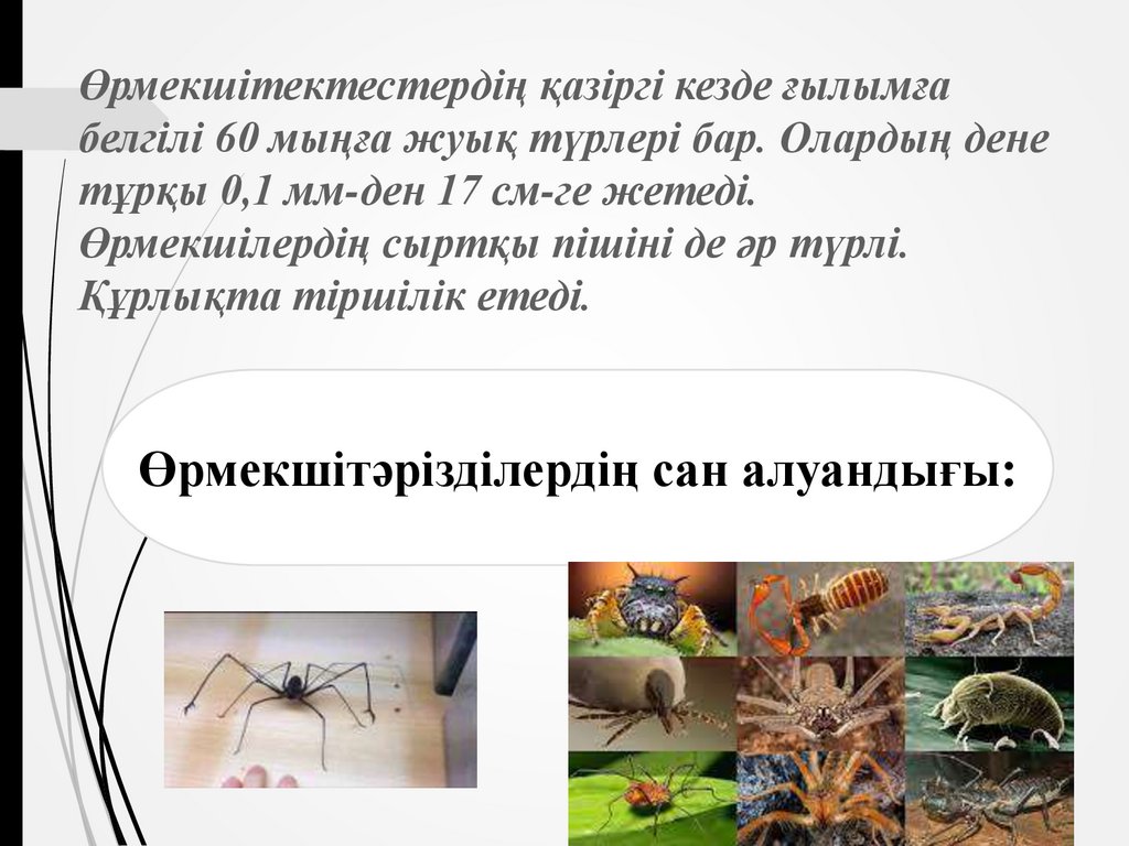 Өрмекшітәрізділердің негізгі ерекшеліктері:ӨРМЕКШIТӘРIЗДIЛЕР КЛАСЫНЫҢ 60 000 түрі бар.