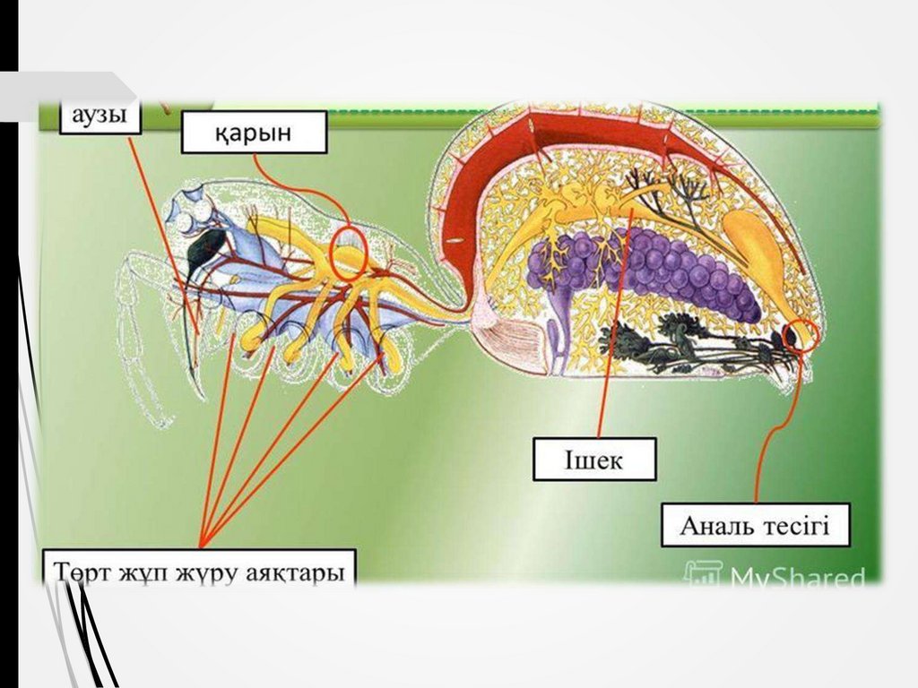 Қанайналым жүйесi - қанайналым жүйесi ашық. жүрегі денесiнiң арқа жағында орналасқан.