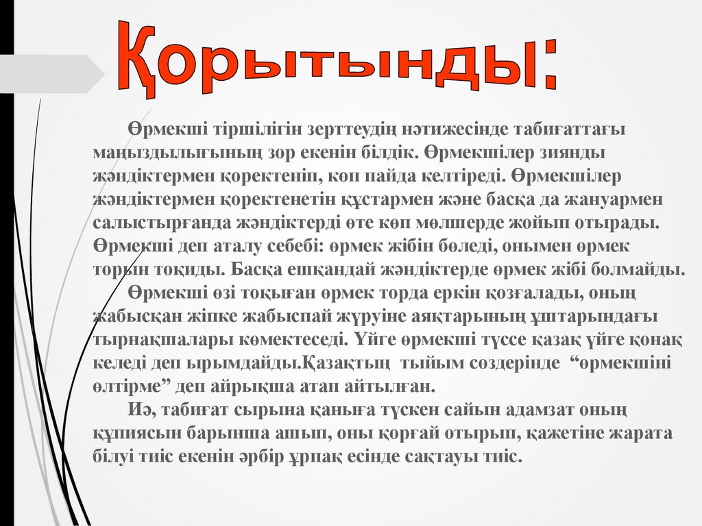 Өрмекші тіршілігін зерттеудің нәтижесінде табиғаттағымаңыздылығының зор екенін білдік. Өрмекшілер зиянды