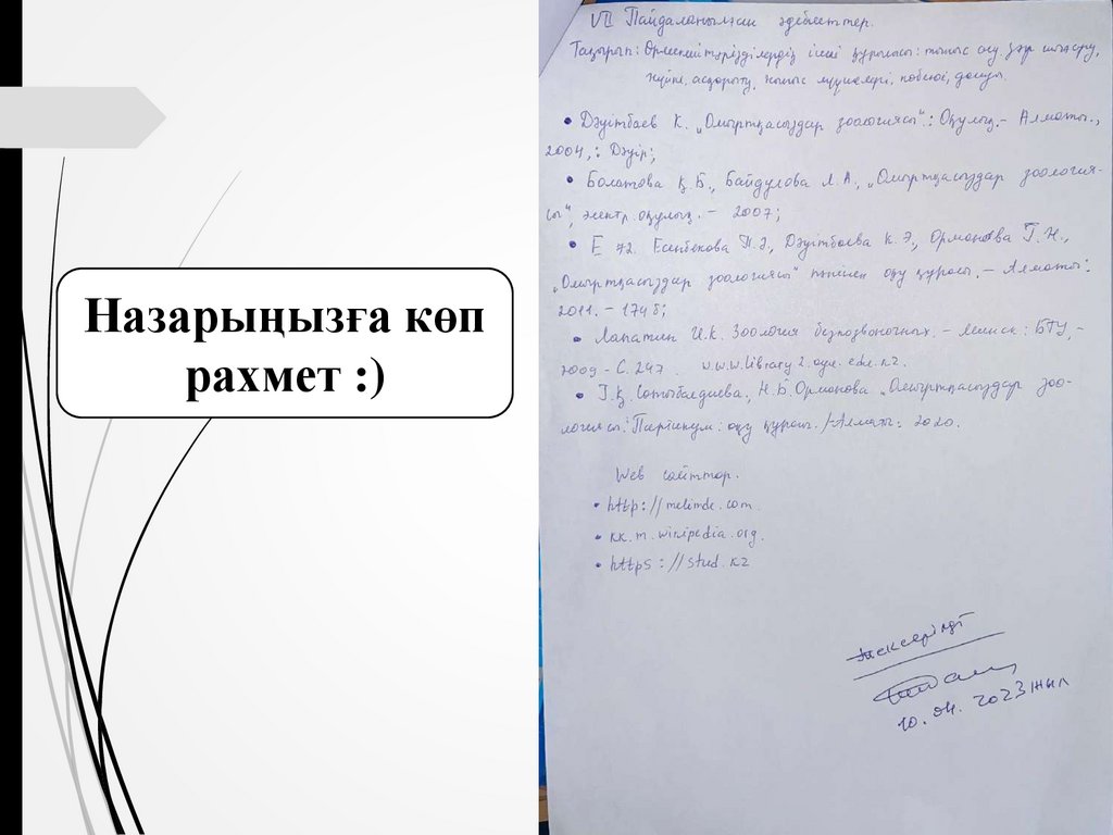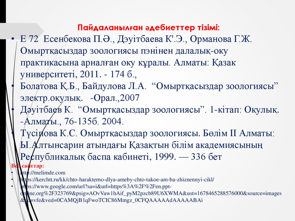 • Болатова Қ.Б., Байдулова Л.А. “Омыртқасыздар зоологиясы”