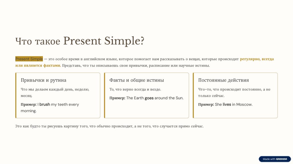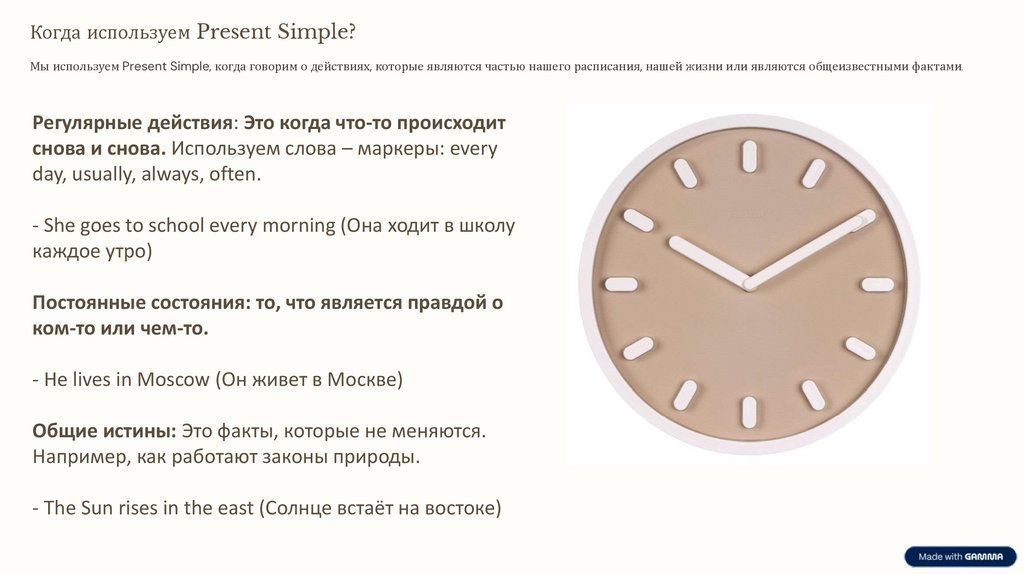 Что такое Present Simple?Present Simple — это особое время в английском языке, которое помогает нам рассказывать о вещах, которые происходят регулярно, всегда