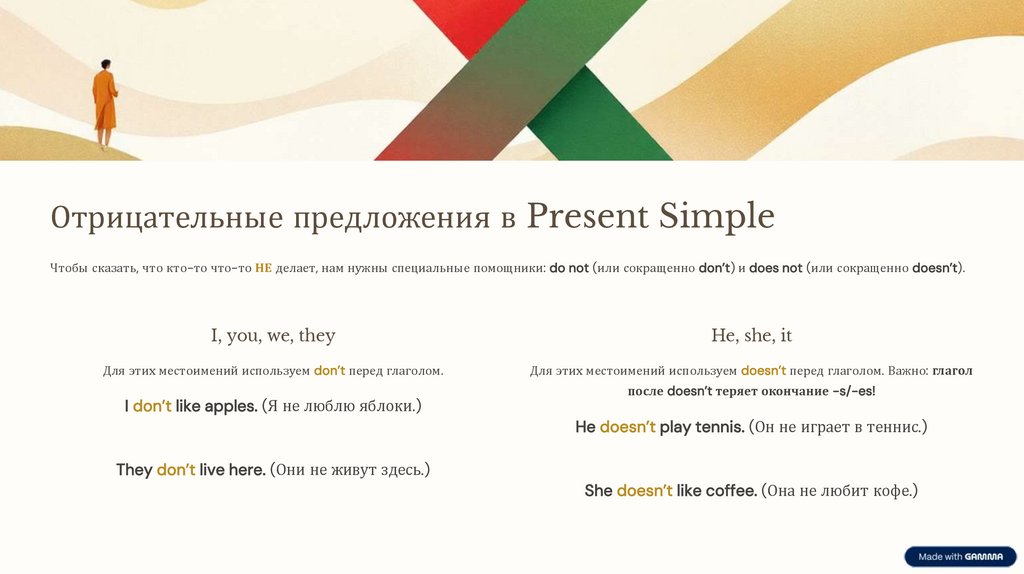 Отрицательные предложения в Present SimpleЧтобы сказать, что кто-то что-то НЕ делает, нам нужны специальные помощники: do not (или сокращенно don’t) и does not (или сокращенно doesn’t).