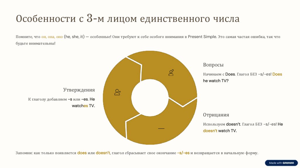 Особенности с 3-м лицом единственного числаПомните, что он, она, оно (he, she, it) — особенные! Они требуют к себе особого внимания в Present Simple. Это самая частая ошибка, так что