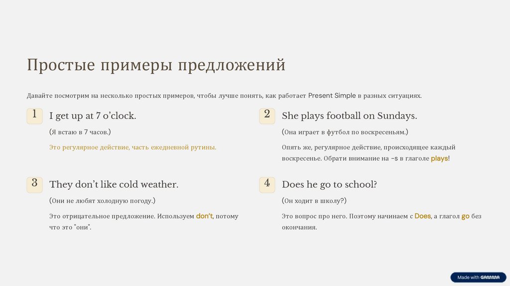 Простые примеры предложенийДавайте посмотрим на несколько простых примеров, чтобы лучше понять, как работает Present Simple в разных ситуациях.