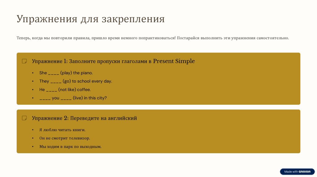 Упражнения для закрепленияТеперь, когда мы повторили правила, пришло время немного попрактиковаться! Постарайся выполнить эти упражнения самостоятельно.