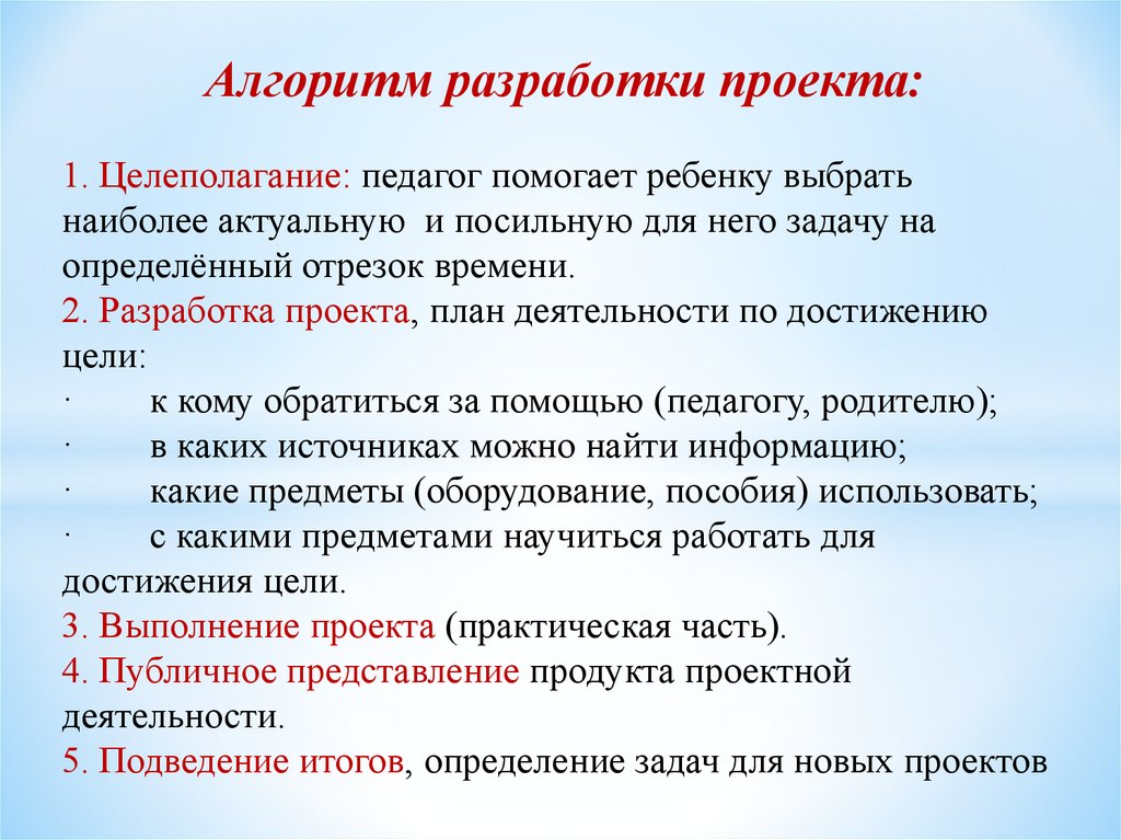 Алгоритм разработки проекта:1. Целеполагание: педагог помогает ребенку выбрать