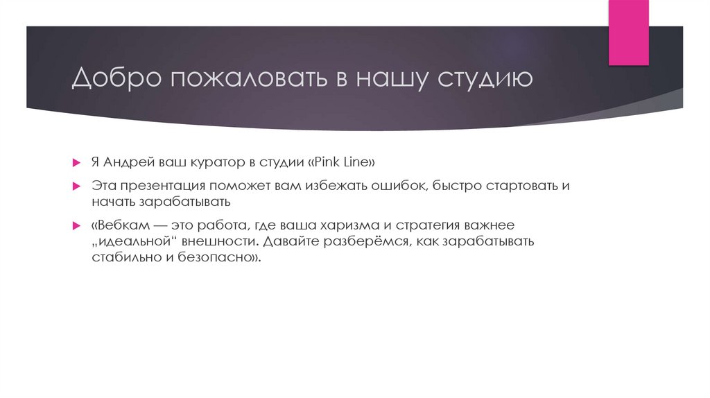 Я Андрей ваш куратор в студии «Pink Line»Эта презентация поможет вам избежать ошибок, быстро стартовать и