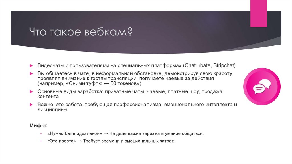 Видеочаты с пользователями на специальных платформах (Chaturbate, Stripchat)Вы общаетесь в чате, в неформальной обстановке, демонстрируя свою красоту,