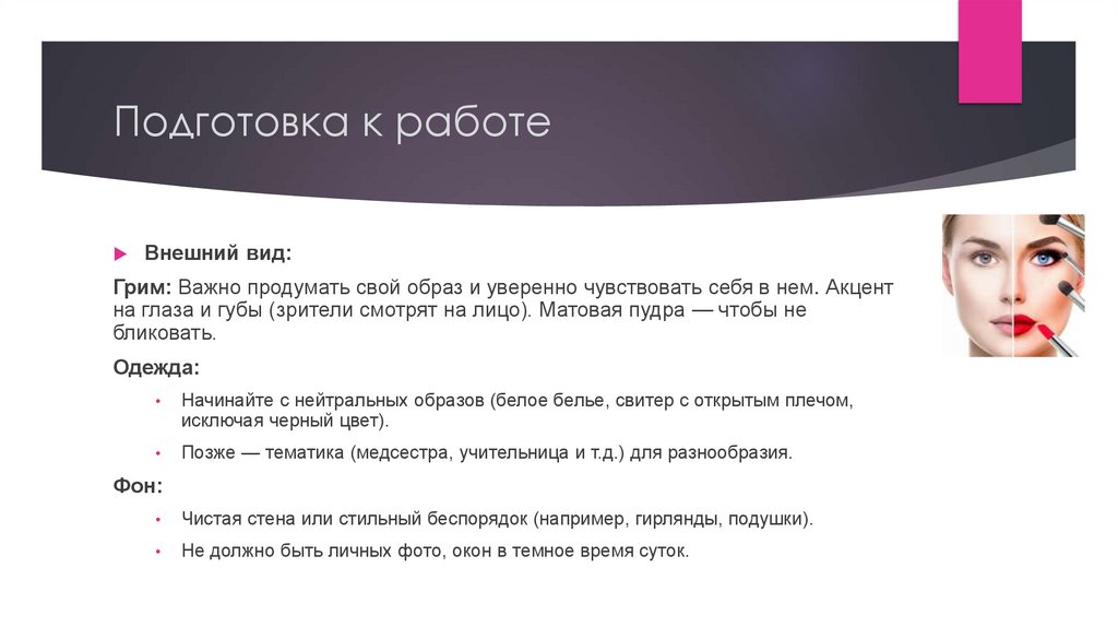 Внешний вид:Грим: Важно продумать свой образ и уверенно чувствовать себя в нем. Акцент