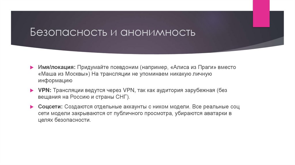 Имя/локация: Придумайте псевдоним (например, «Алиса из Праги» вместо«Маша из Москвы») На трансляции не упоминаем никакую личную