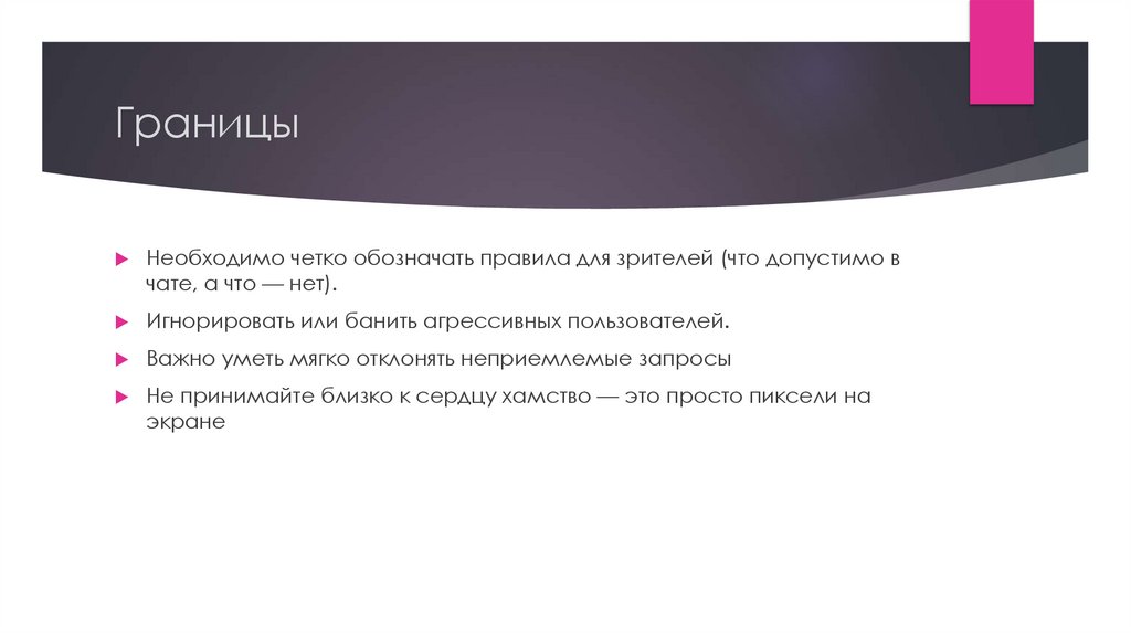 Необходимо четко обозначать правила для зрителей (что допустимо вчате, а что — нет).