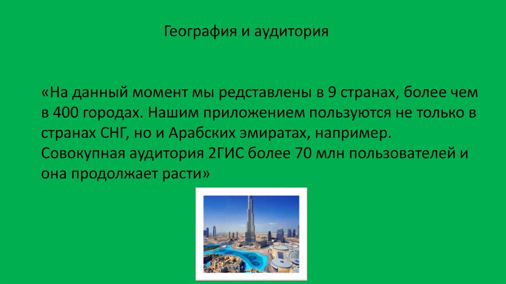 География и аудитория«На данный момент мы редставлены в 9 странах, более чем