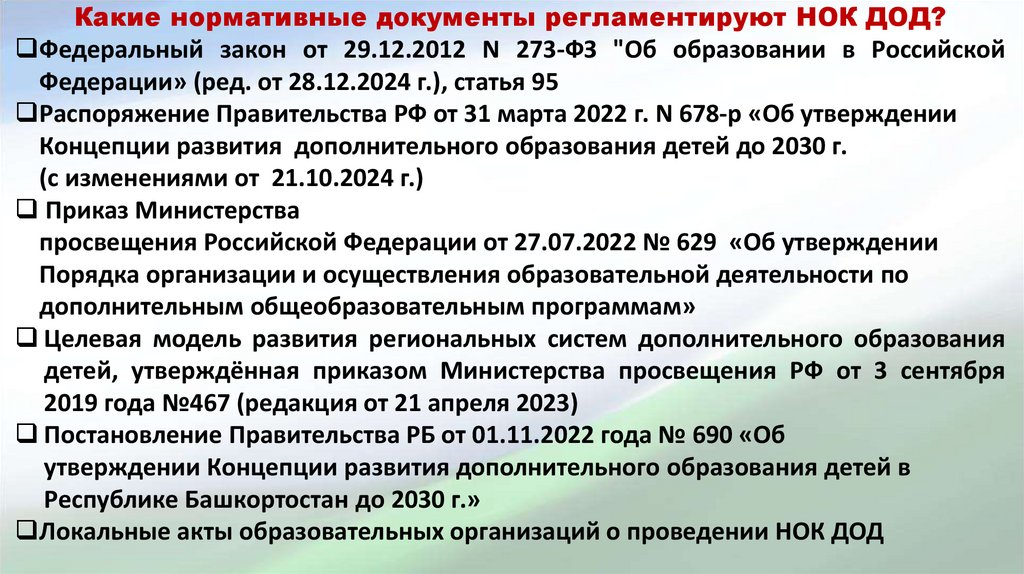 Какие нормативные документы регламентируют НОК ДОД?Федеральный закон от 29.12.2012 N 273-ФЗ "Об образовании в Российской