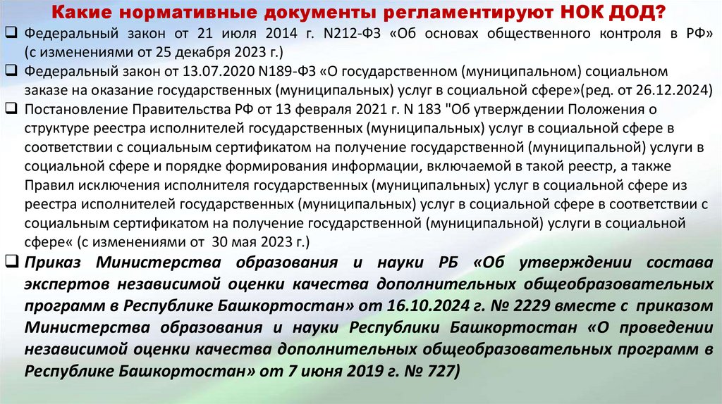 Какие нормативные документы регламентируют НОК ДОД?Федеральный закон от 21 июля 2014 г. N212-ФЗ «Об основах общественного контроля в РФ»