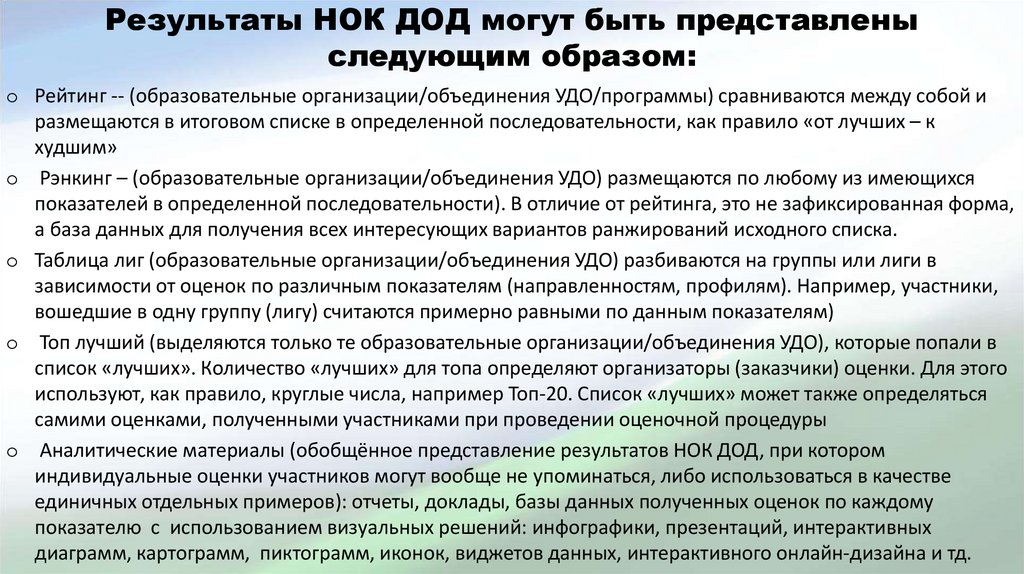 o Аналитические материалы (обобщённое представление результатов НОК ДОД, при котором