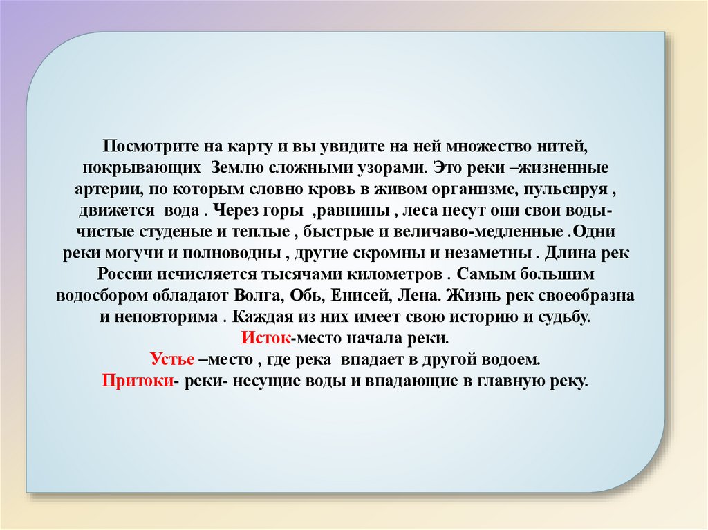 водосбором обладают Волга, Обь, Енисей, Лена. Жизнь рек своеобразна