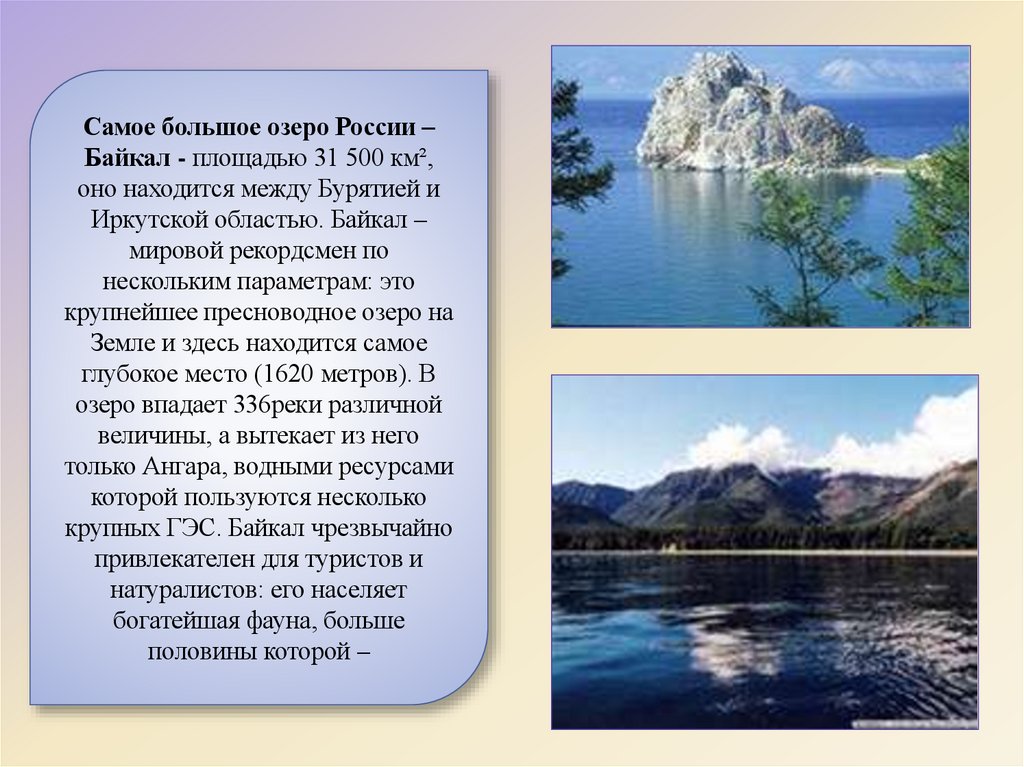 Самое большое озеро России –Байкал - площадью 31 500 км²,