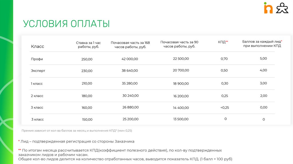 Общее кол-во лидов делится на количество отработанных часов, выводится показатель КПД. (1 балл = 100 руб)