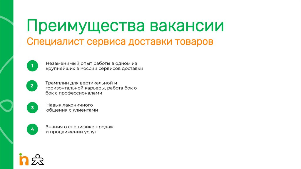 Преимущества вакансииСпециалист сервиса доставки товаров