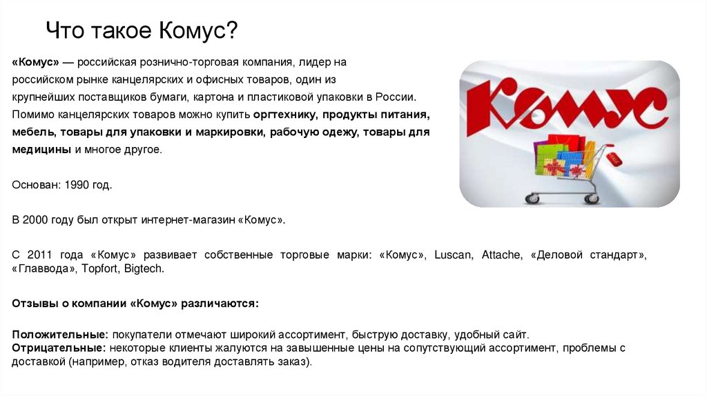 Что такое Комус?«Комус» — российская рознично-торговая компания, лидер на