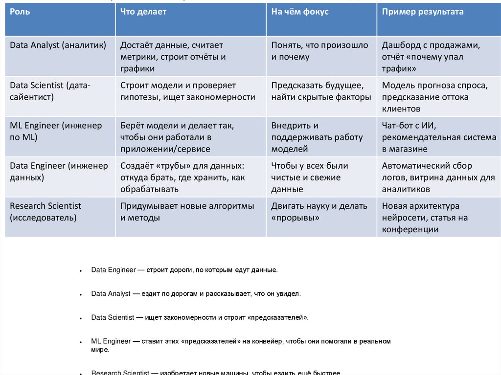 Analyst ⇄ DS: оба делают анализ и эксперименты; у DS больше акцент на моделях/причинности.