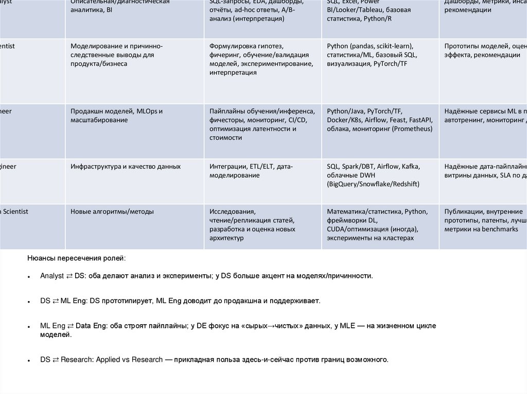 DS ⇄ ML Eng: DS прототипирует, ML Eng доводит до продакшна и поддерживает.
