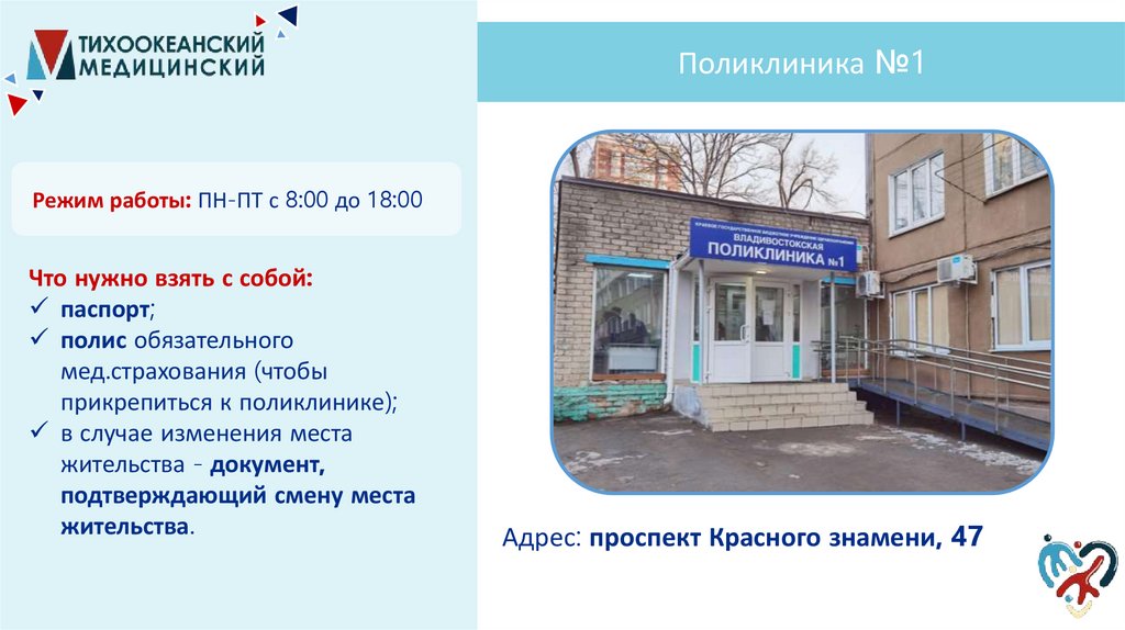 Поликлиника №1Режим работы: ПН-ПТ с 8:00 до 18:00