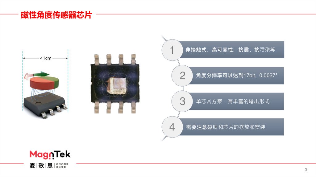 麦歌恩 MagnTek 的系列磁性角度编码器芯片 采用了各向异性磁阻技术 AMR 。芯片感应平行于芯片表面的磁