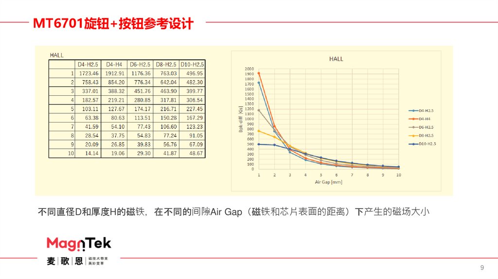 MT6701旋钮+按钮参考设计不同直径D和厚度H的磁铁 在不同的间隙Air Gap 磁铁和芯片表面的距离 下产生的磁场大小