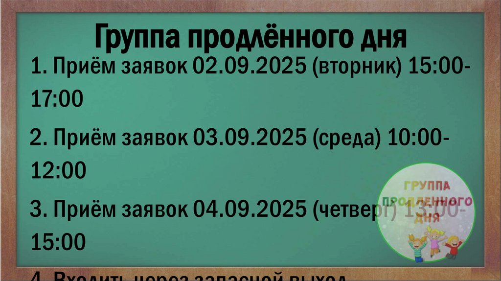 Группа продлённого дня1. Приём заявок 02.09.2025 (вторник) 15:0017:00