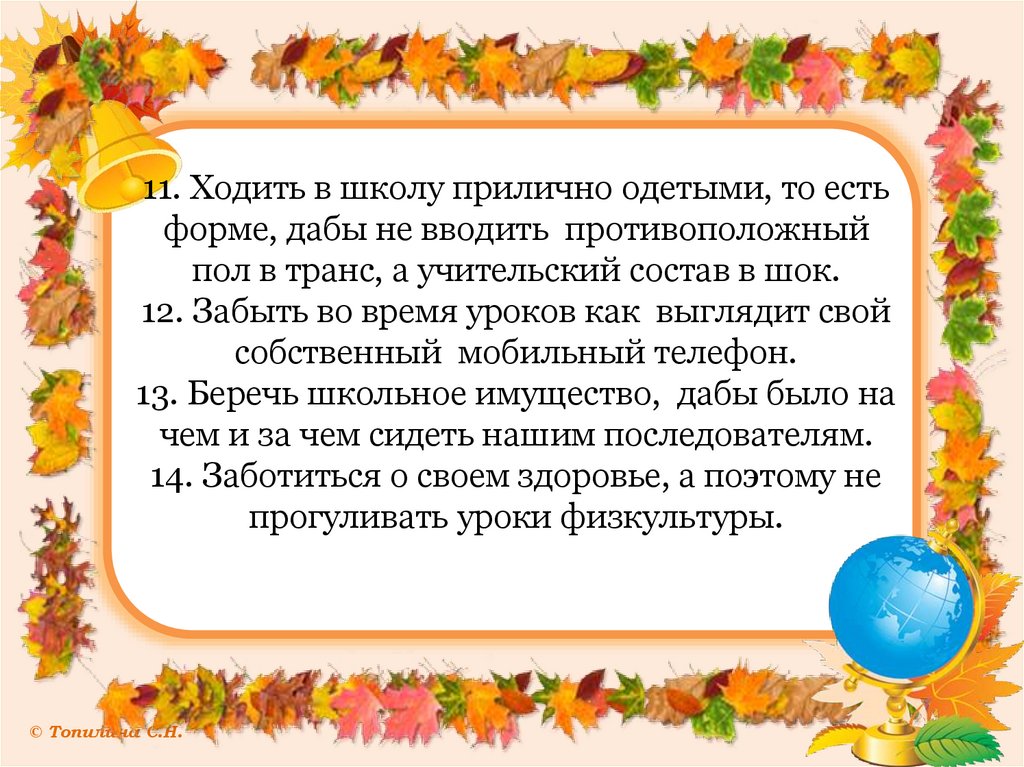 11. Ходить в школу прилично одетыми, то естьформе, дабы не вводить противоположный