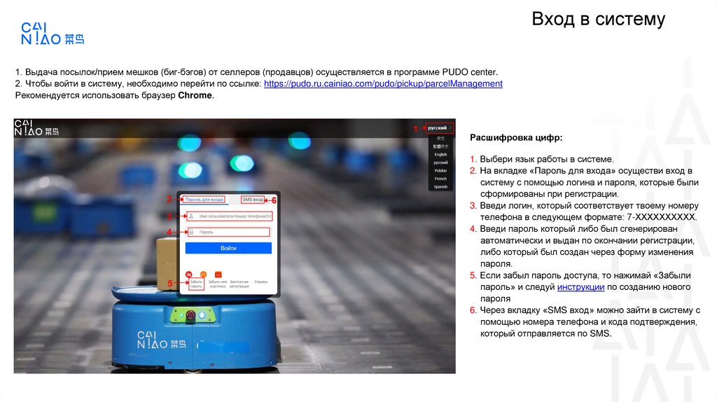 2. Чтобы войти в систему, необходимо перейти по ссылке: https://pudo.ru.cainiao.com/pudo/pickup/parcelManagement