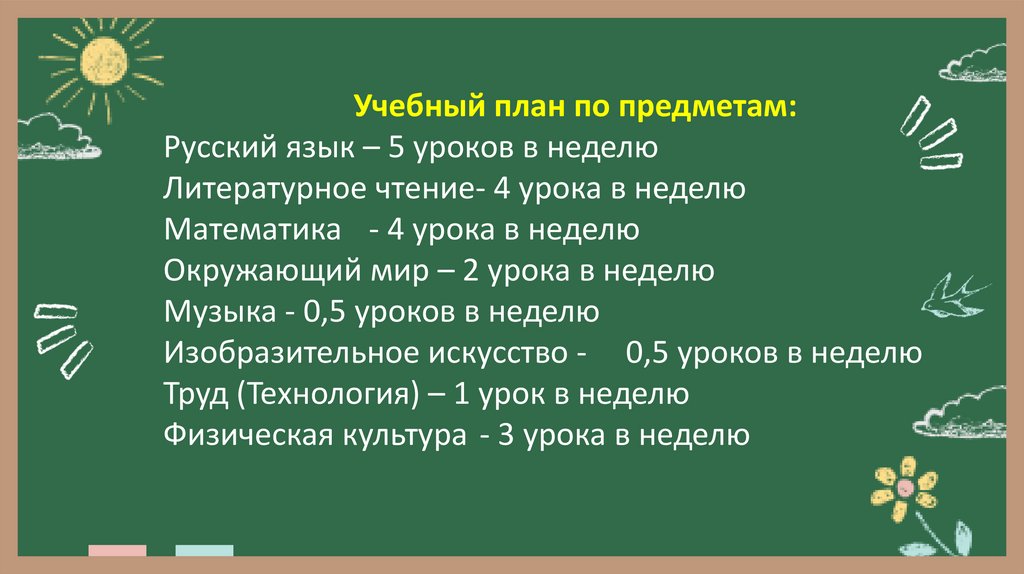 Учебный план по предметам:Русский язык – 5 уроков в неделю