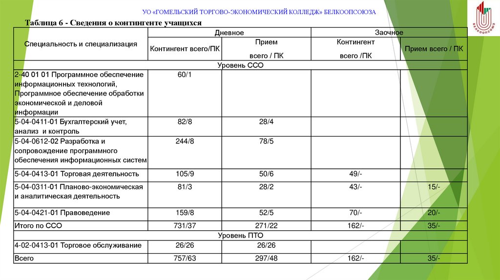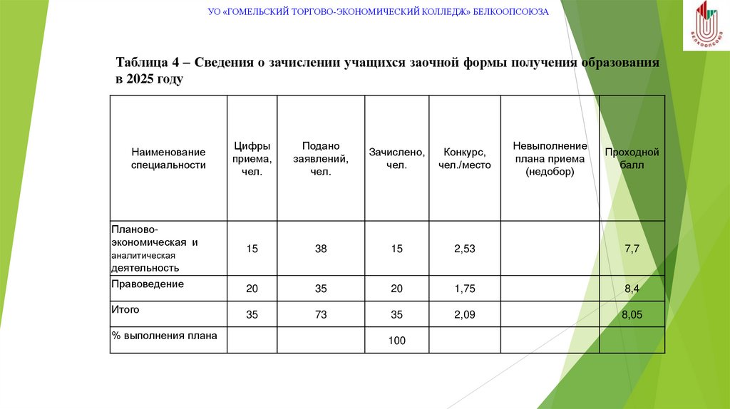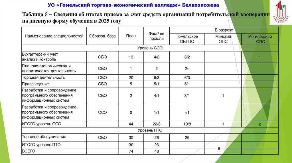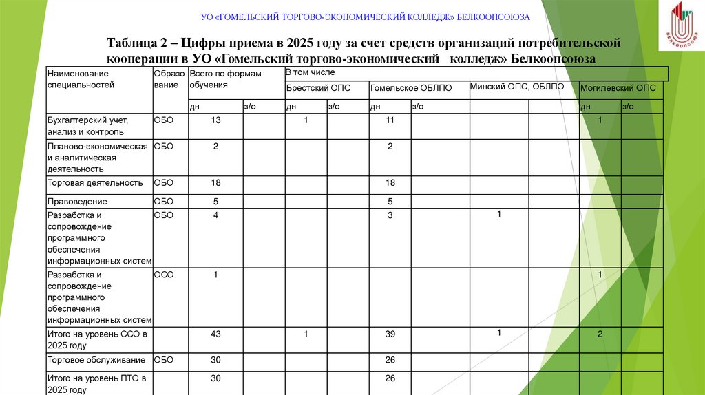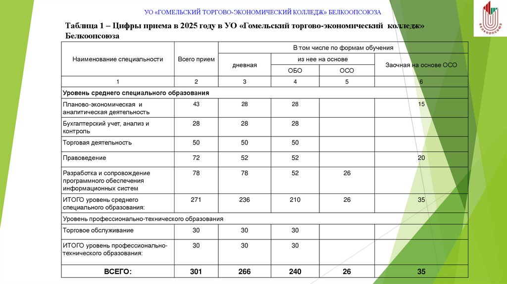 УО «ГОМЕЛЬСКИЙ ТОРГОВО-ЭКОНОМИЧЕСКИЙ КОЛЛЕДЖ» БЕЛКООПСОЮЗАТаблица 1 – Цифры приема в 2025 году в УО «Гомельский торгово-экономический колледж»
