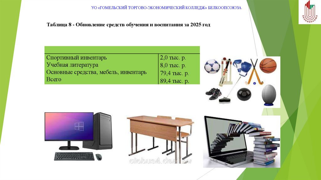 УО «ГОМЕЛЬСКИЙ ТОРГОВО-ЭКОНОМИЧЕСКИЙ КОЛЛЕДЖ» БЕЛКООПСОЮЗАТаблица 8 - Обновление средств обучения и воспитания за 2025 год