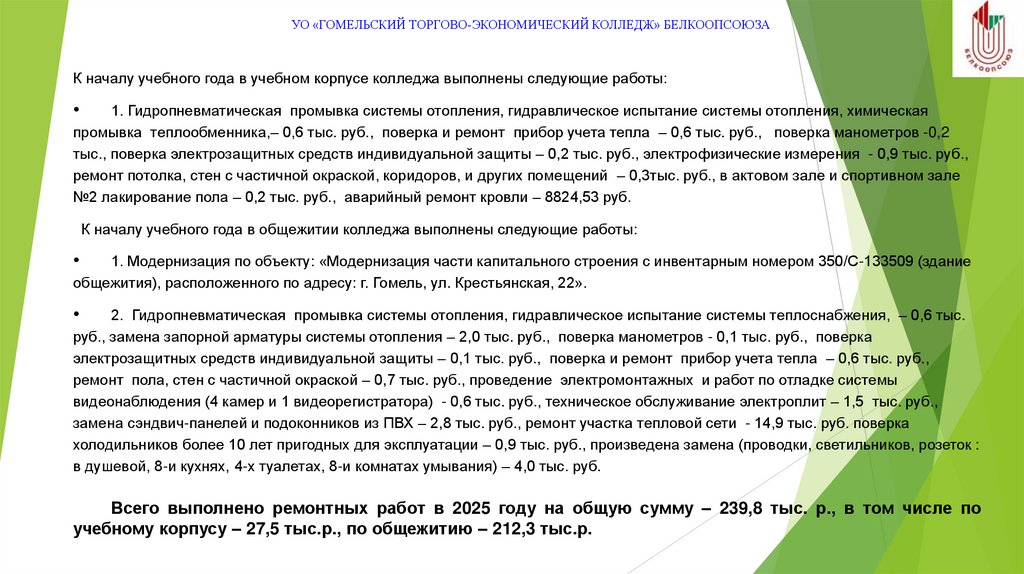 УО «ГОМЕЛЬСКИЙ ТОРГОВО-ЭКОНОМИЧЕСКИЙ КОЛЛЕДЖ» БЕЛКООПСОЮЗАК началу учебного года в учебном корпусе колледжа выполнены следующие работы:
