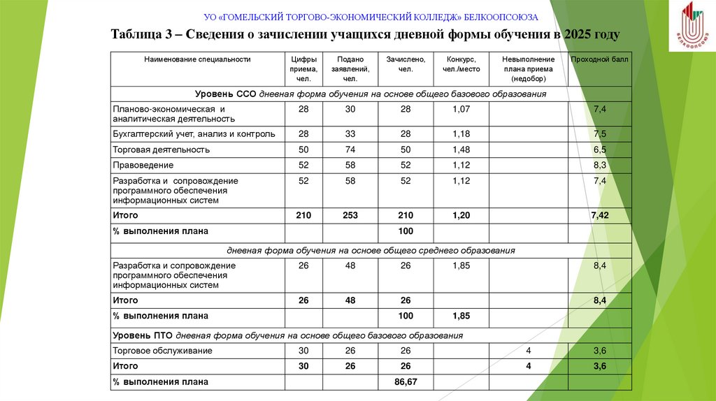 УО «ГОМЕЛЬСКИЙ ТОРГОВО-ЭКОНОМИЧЕСКИЙ КОЛЛЕДЖ» БЕЛКООПСОЮЗАТаблица 3 – Сведения о зачислении учащихся дневной формы обучения в 2025 году