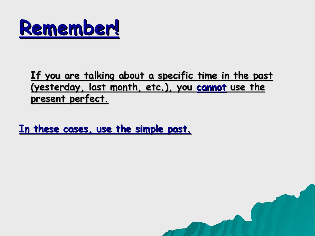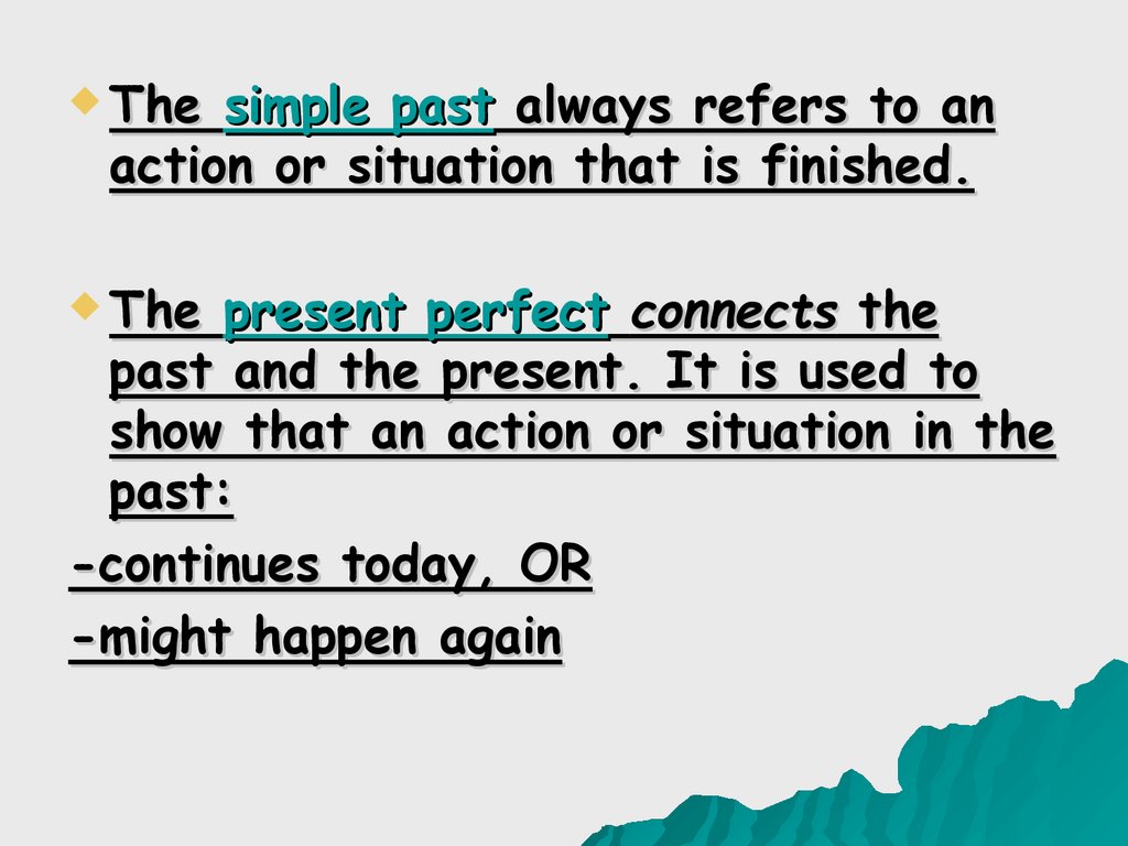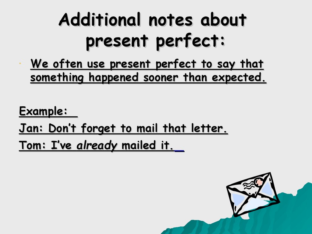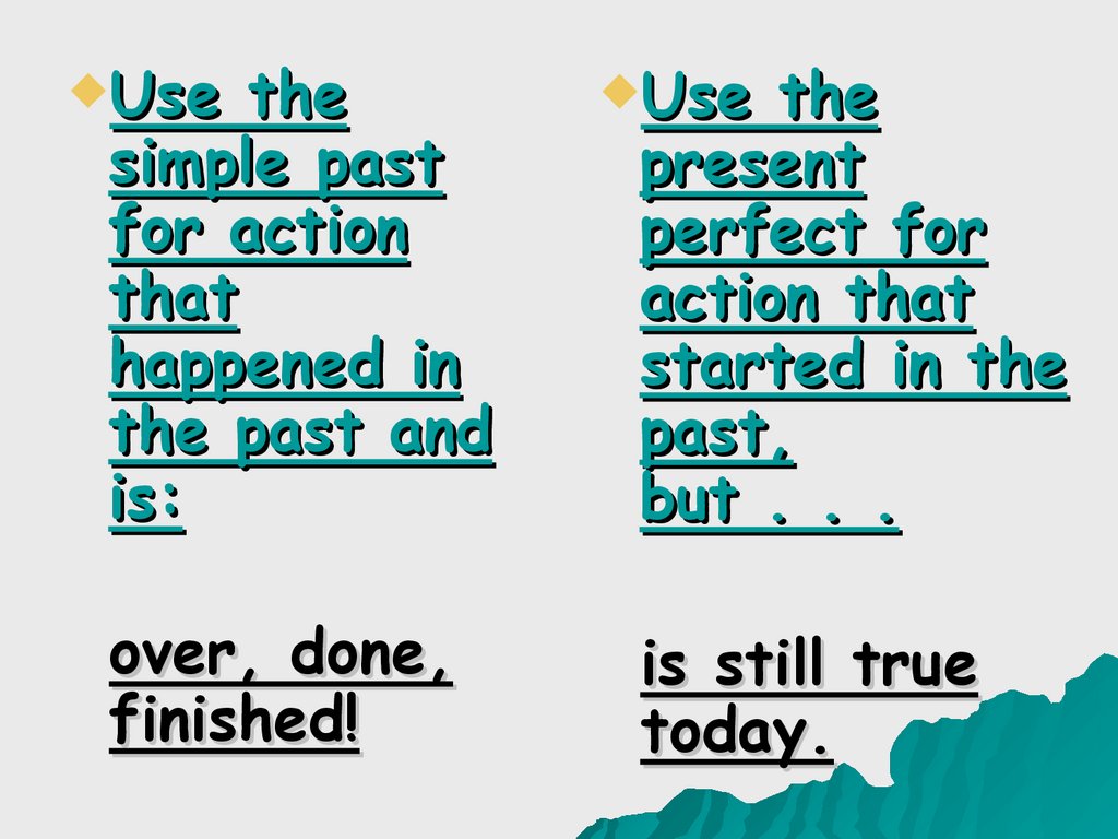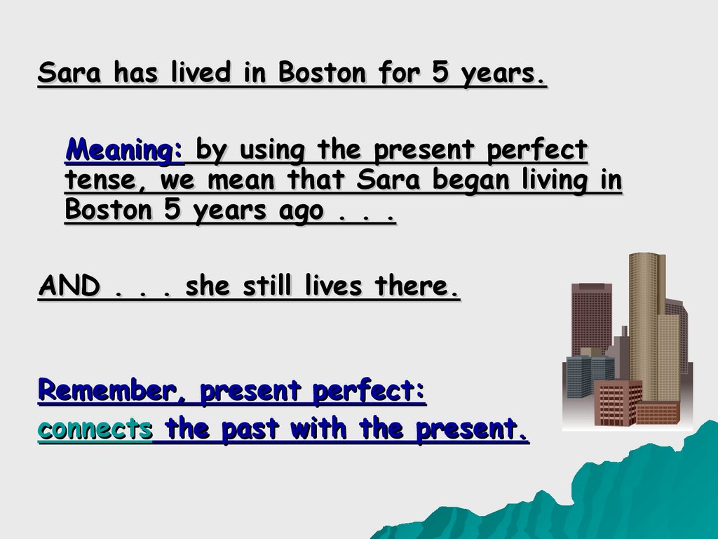 Sara has lived in Boston for 5 years.Meaning: by using the present perfect