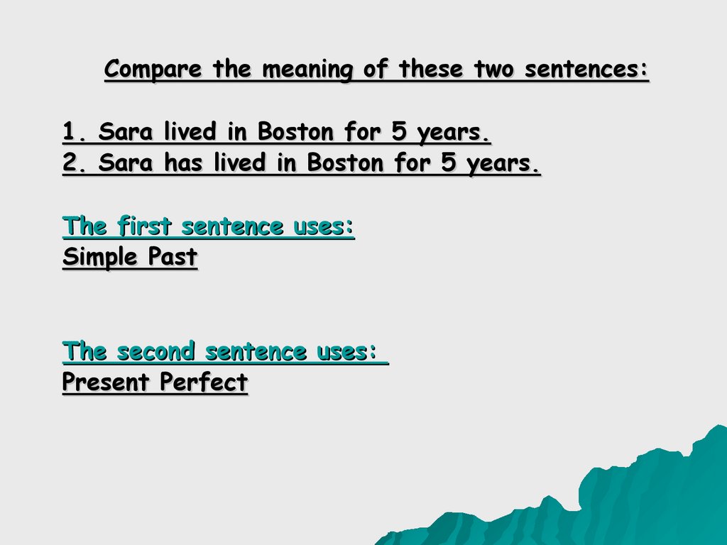 Compare the meaning of these two sentences:1. Sara lived in Boston for 5 years.