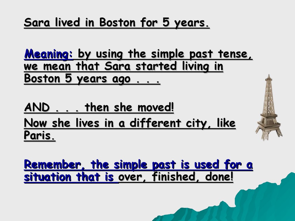 Sara lived in Boston for 5 years.Meaning: by using the simple past tense,