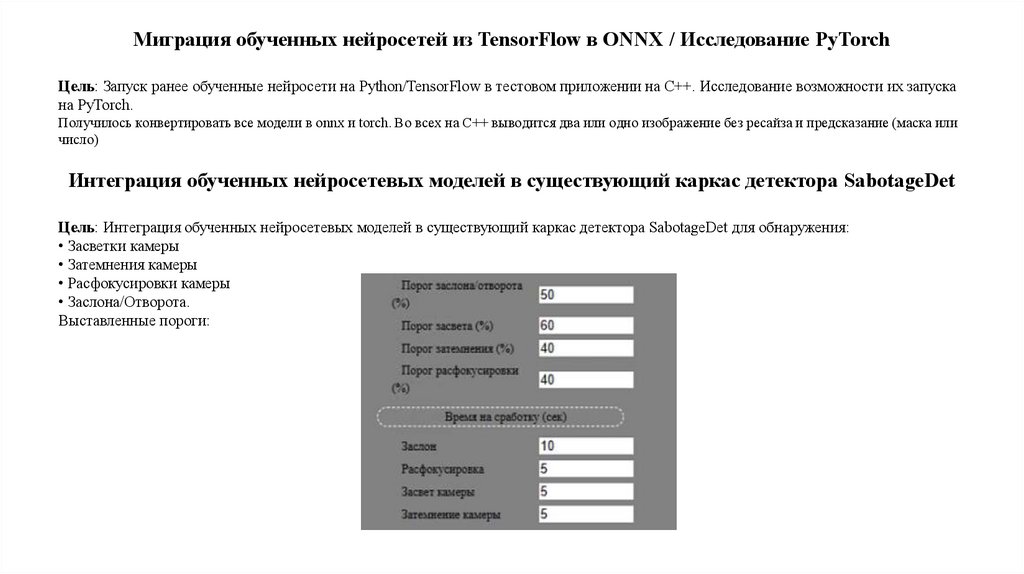 Миграция обученных нейросетей из TensorFlow в ONNX / Исследование PyTorchЦель: Запуск ранее обученные нейросети на Python/TensorFlow в тестовом приложении на C++. Исследование возможности их запуска