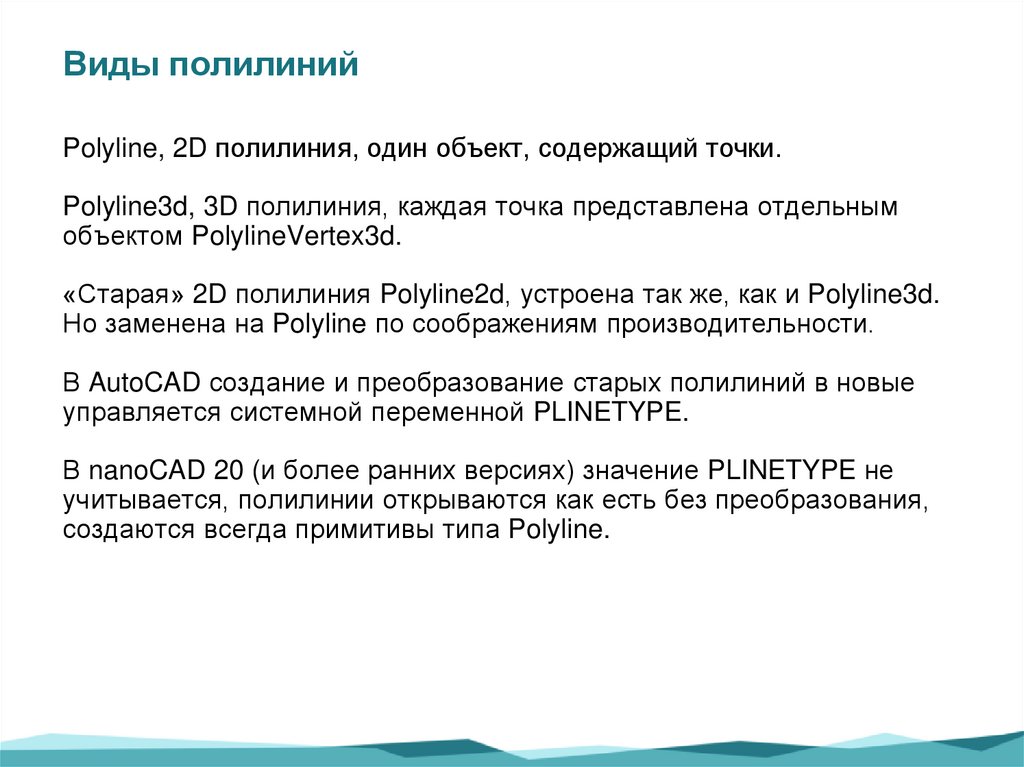 Виды полилинийPolyline, 2D полилиния, один объект, содержащий точки.