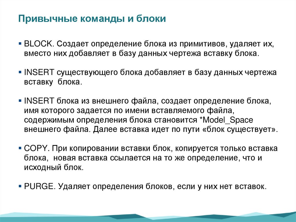 Привычные команды и блокиBLOCK. Создает определение блока из примитивов, удаляет их,