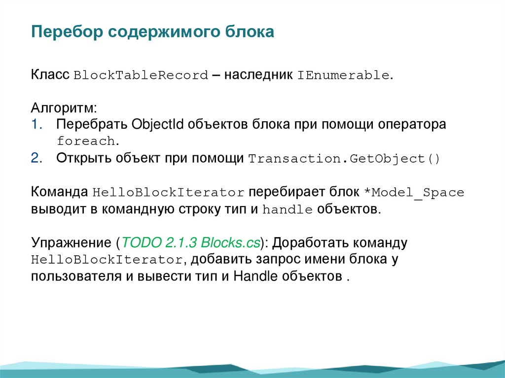 Перебор содержимого блокаКласс BlockTableRecord – наследник IEnumerable.