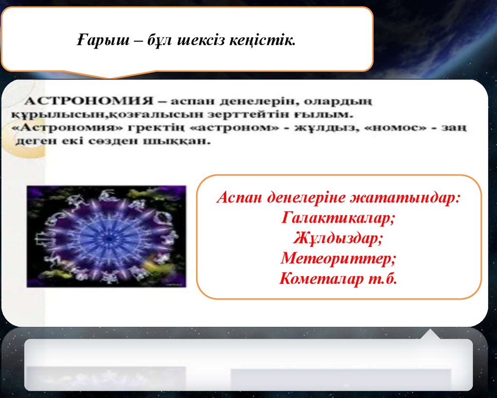 Ғарыш – бұл шексіз кеңістік.Аспан денелеріне жататындар: