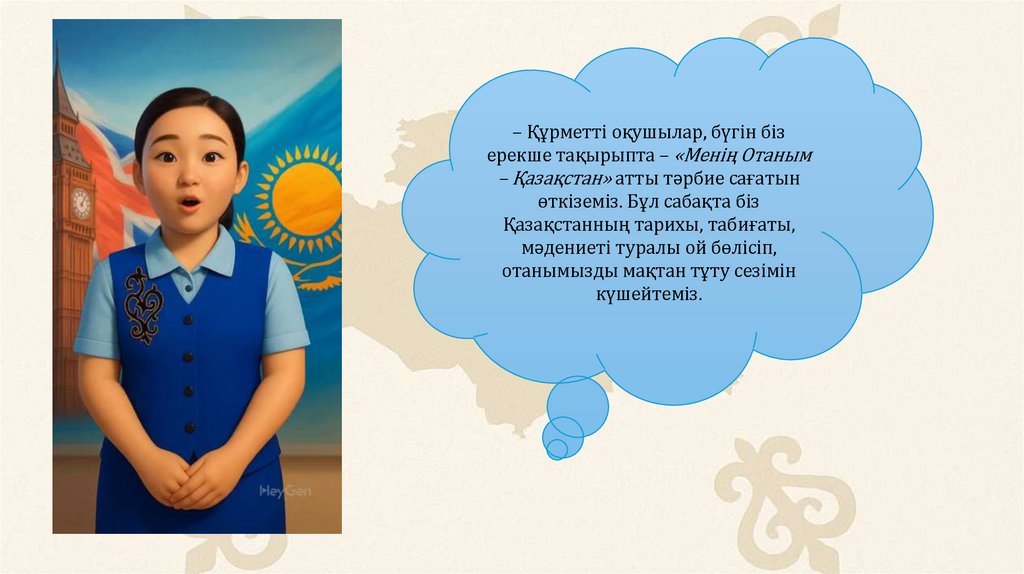 – Құрметті оқушылар, бүгін бізерекше тақырыпта – «Менің Отаным