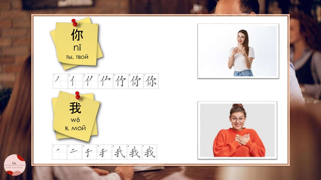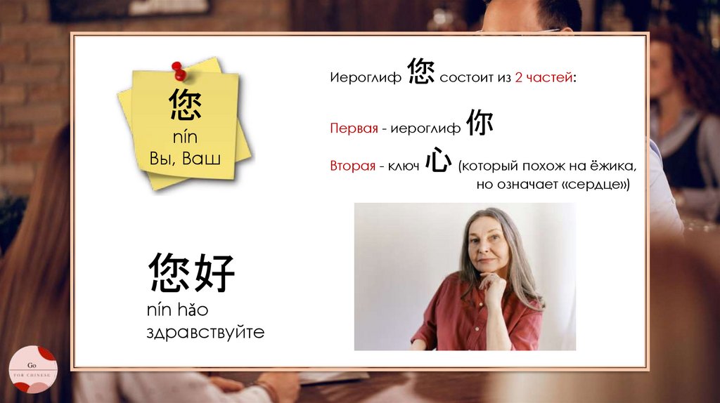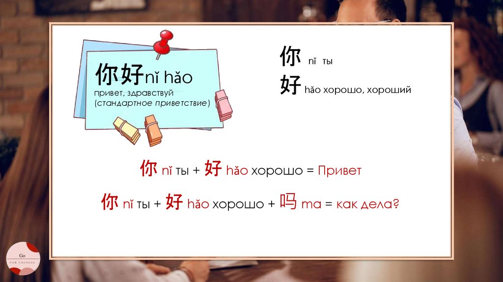 你 nǐ ты + 好 hǎo хорошо = Привет