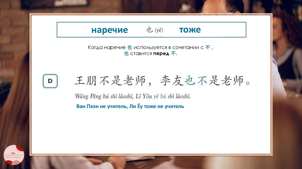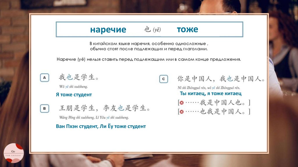 Наречие (yě) нельзя ставить перед подлежащим или в самом конце предложения.
