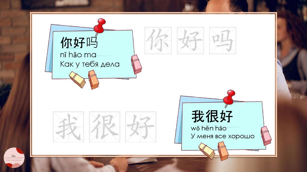 你 nǐ ты + 好 hǎo хорошо + 吗 ma = как дела?