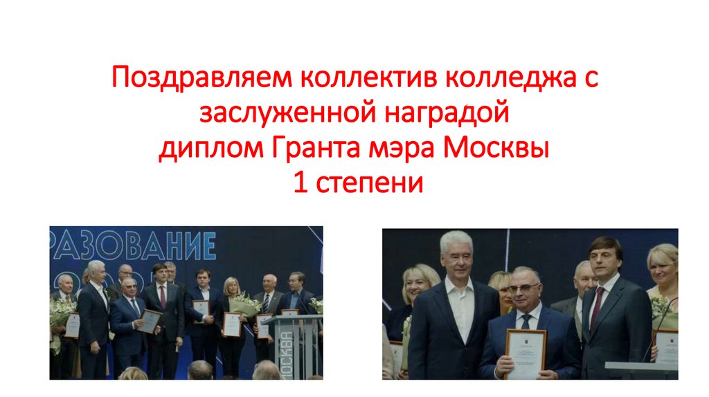 1. Поздравляем коллектив колледжа с заслуженной наградой диплом Гранта мэра Москвы 1 степени
